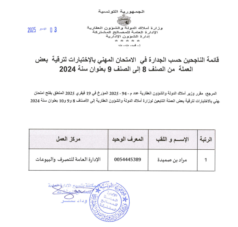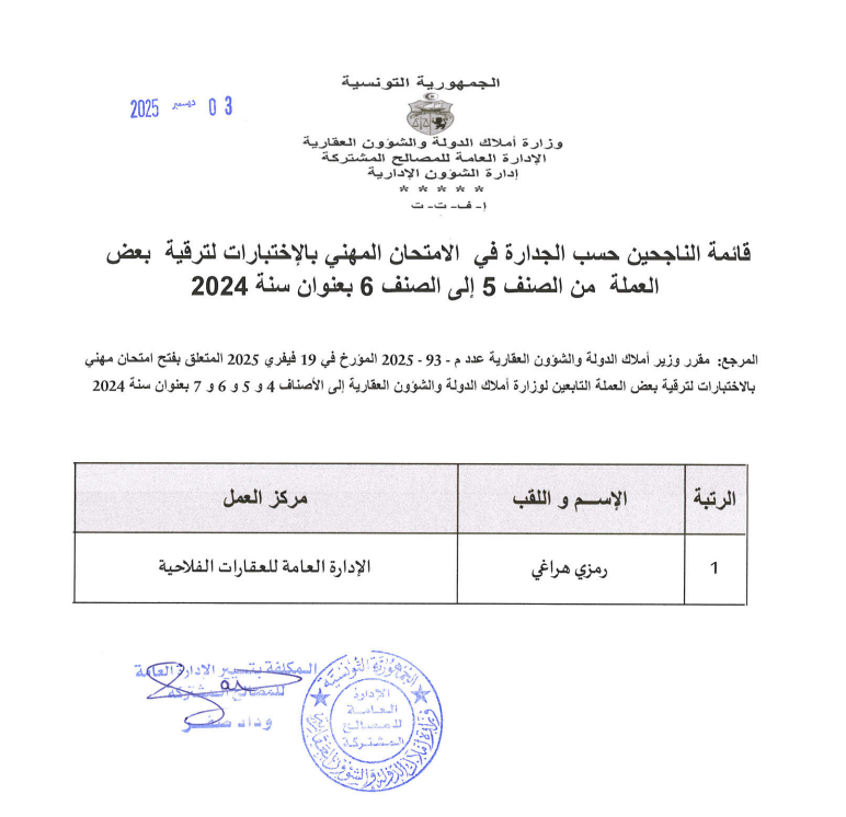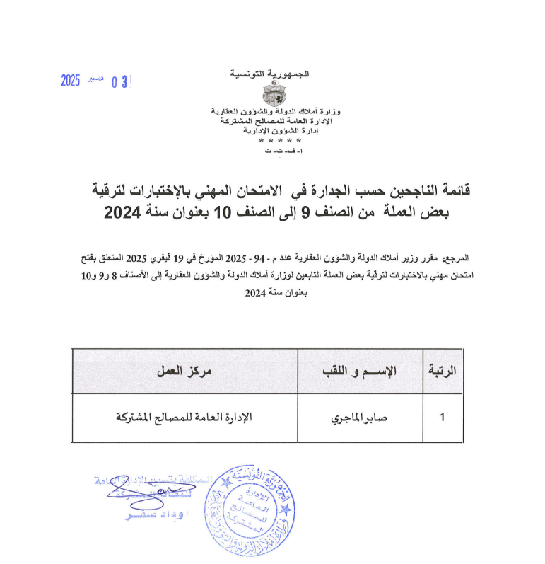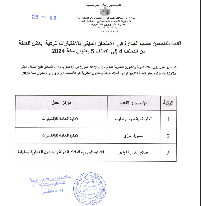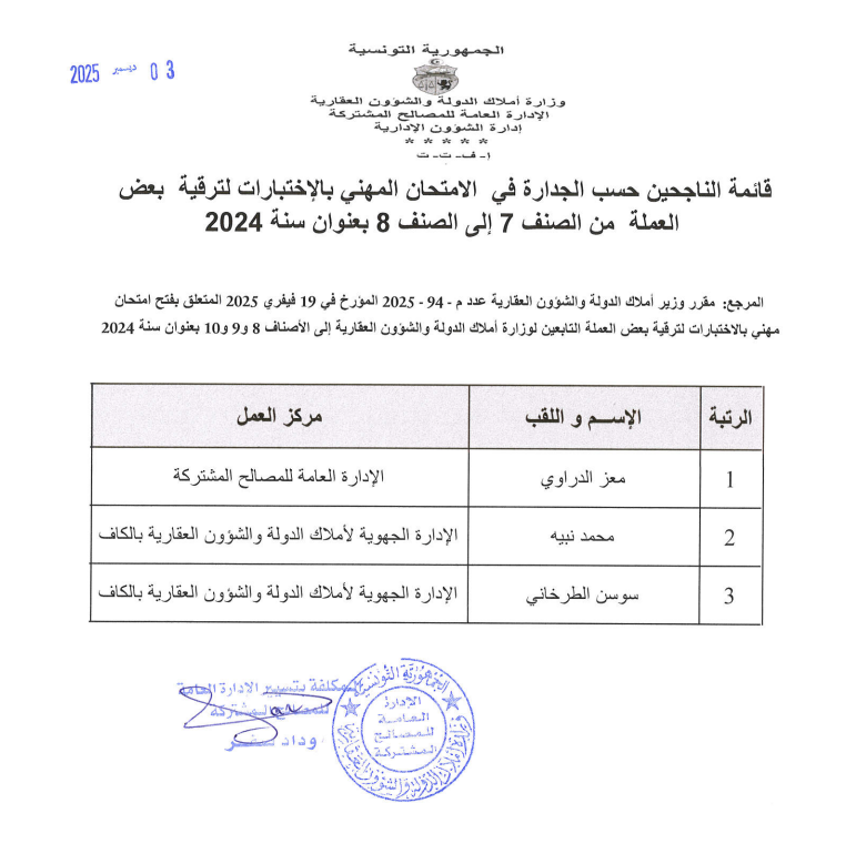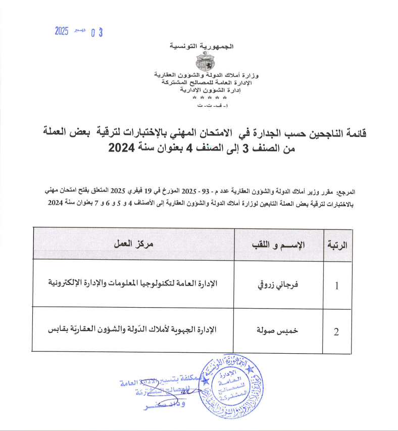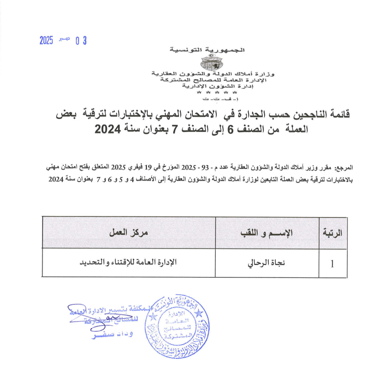 قائمات الناجحين حسب الجدارة في الإمتحان المهني بالإختبارات بعنوان سنة 2024. Post published:3 ديسمبر 2025 Post category:الأخبار / مناظرات داخلية قد يعجبك ايضا فريق رقابي يتفقد كيفية استغلال السيارات الادارية 23 فبراير 2021 منوبة: استرجاع عقــار دولي فلاحي على مســاحة 30 هك. 20 ديسمبر 2021 تطوير آليات العمل والرفع من نسقه بالإدارة العامة للتصرّف والبيوعات محور جلسة عمل برئاسة وزير أملاك الدولة والشؤون العقارية 17 يونيو 2025