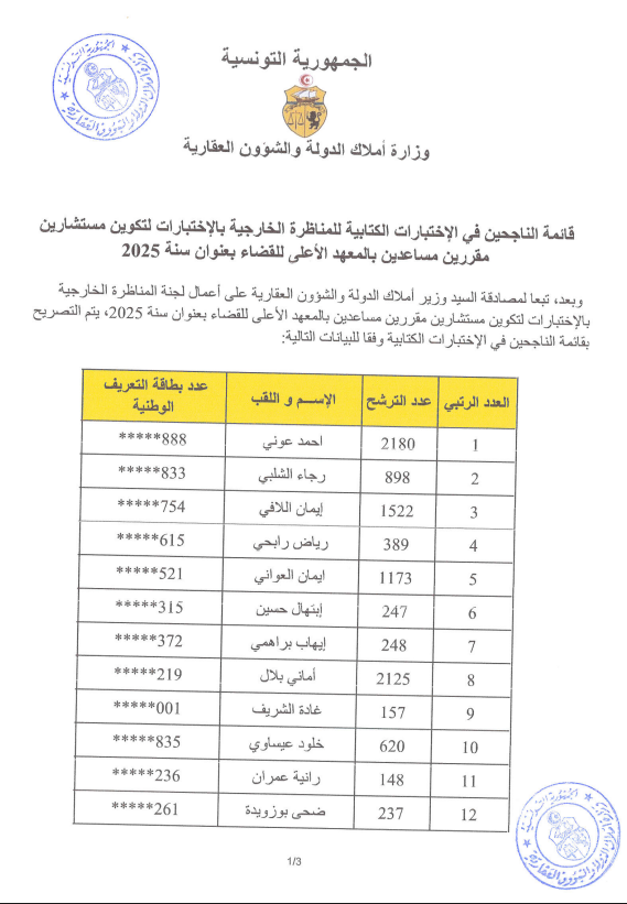 قائمة الناجحين في الإختبارات الكتابية للمناظرة الخارجية بالإختبارات لتكوين مستشارين مقررين مساعدين بالمعهد الأعلى للقضاء بعنوان سنة 2025. Post published:3 فبراير 2026 Post category:الأخبار / مناظرات خارجية قد يعجبك ايضا خلال زيارة اداها رئيس الحكومة الى ولاية منوبة : مبروك كرشيد يعلن عن تسوية وضعية عقارات سكنية وفلاحية تهم حوالي 5 آلاف مواطن في الفجة وأكثر من 40 ألف فلاّح 23 فبراير 2021 كرشيد : المحاكم التونسية حكمت منذ 2011 بتطبيق اتفاقية الاستيطان وقرار عن حكومة الصيد بالتسجيل دون رخصة الوالي. 23 فبراير 2021 كرشيد في افتتاح ندوة المديرين للملكية العقارية:”نعمل على تسليم مختلف شهائد الملكية لحظة تقديم العقد للإدارة 23 فبراير 2021